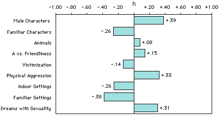 As an added bonus for using percentages, we can use a mathematically transformed version of the percentage differences between a new dream sample and our norms to create what we call the "h profile," which is a bar graphic display of all differences from the norms. Here's the h profile for males when they are compared with our female norms: