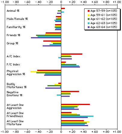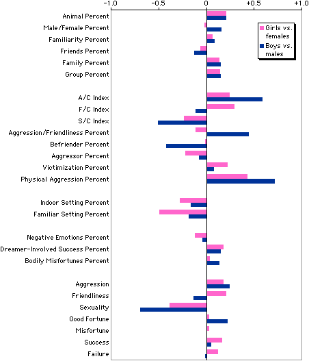 Finally, the usefulness of h-profiles for group comparisons is shown in Figure 3, where the Most Recent Dreams of 12-13 year-old girls and boys are compared with each other and with the norms for women and men by using the norms for women and men as the baseline [29]. It reveals that girls and boys tend to differ from each other in the same ways women and men differ, with the young teenagers further from the adults on the A/C ratio and physical aggression percent. However, girls and boys go in different ways on the friendliness/character (F/C) ratio; girls have more friendly interactions than women, boys have less friendly interactions than men.