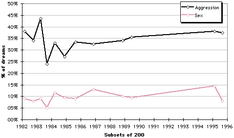 This method can be used to see how groups or individuals differ from the norms, or to study consistency over time. Figure 3 shows the consistency of aggression and sexuality over a 14-year period in 3,256 dream reports from a young adult male who began his journal at age 18. All dream reports from 1981 to 1989 and for 1995-96 were examined separately by each author in the space of a few hours. The relatively consistent findings for aggression are somewhat below the norms and the very consistent findings for sexuality are very close to the norms.