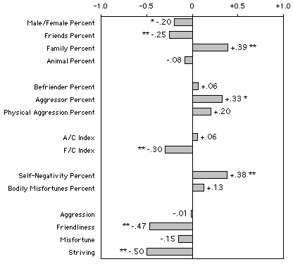 Effect Sizes and the h-ProfileAs just noted, statistical significance does not seem to be as important in psychological research as was claimed in the past. The more important matter is the magnitude of any reliable differences that are found, which is revealed by "effect sizes." For nominal data in 2 X 2 tables, the effect size is basically the percentage difference between the cells in the top row of the table. This percentage difference is also the same as the Pearson r for dichotomous variables (Rosenthal & Rubin, 1982). In addition, the two measures for effect size associated with chi square, phi (f) and lambda ( l ), are equal to r. However, there is a slight complication. In determining effect sizes with data expressed in percentages, a mathematical correction has to be made because the standard deviation of the sampling distribution cannot be determined due to the fact that the varying distances between scores are unknown when there are only percentile ranks. To deal with this problem, Cohen (1977) developed the "h" statistic, which makes the necessary correction using an arcsine transformation of the percentage difference between any two comparison groups. A table for determining h from percentages is provided by Domhoff (1996, p. 315) and is calculated by DreamSAT for each percentage indicator in the Hall/Van de Castle system once the codings are entered (Schneider & Domhoff, 1999). The importance of taking effect size into consideration is shown in this special issue in Domhoff and Schneider's (1999) reanalysis of the differences between the home and laboratory dreams collected in a large-scale study by Hall and Van de Castle in the 1960s (Hall 1966b). The original study reported several statistically significant differences between dreams written down at home and those reported in the laboratory, contributing to a controversy over the relative merits of the two collection methods. However, the reanalysis using effect sizes shows that most of the statistically significant differences were not very large in terms of magnitude. The small to medium effect sizes in Domhoff and Schneider's reanalysis suggest that the overall controversy involved much ado about not very much. Perhaps the conflict could have been avoided if effect sizes rather than "significance levels" had been stressed at the time. The effect sizes for any array of comparisons with Hall/Van de Castle indicators can be placed on a bar graph that resembles an MMPI profile. It reveals any unique patterns in the overall analysis, such as might be found in character categories or types of social interactions. This display has been named the "h-profile" (Domhoff, 1996). It can be especially useful in showing the way in which an individual or special population differs from the male or female norms. Effect sizes and h-profiles are produced as both tables and graphs by DreamSAT. Figure 1 presents the h-profile for 104 dream reports from 20 male schizophrenics that were coded by Hall (1966a) and then reanalyzed by Schneider and Domhoff (1999) by entering the original Hall codings into DreamSAT. The h-profile immediately reveals the magnitude of the several differences that were mentioned in an earlier section of this paper. The differences on friendliness categories and the self-negativity percent are notable. Such reanalyses of old codings are easily done with DreamSAT.