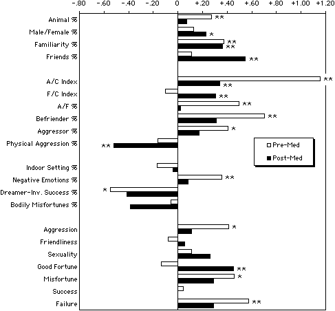 The post-medication dreams differed significantly from the pre-medication dreams in several of the content categories (see Table 1). The effect sizes were often above .40, which is considered large for dream content studies (Domhoff, 1996). The most dramatic effect is the post-medication decrease in the A/C Index, the ratio of aggressive acts to characters (h = -.82, p < .001). The aggression/friendliness percent also decreased (h = -.48, p < .003).