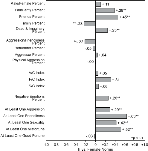 There is good reason to believe that h works just as well with the "repeated measures" of a long dream series from one person as it does with independent samples. This claim derives from a simulation study using 10,000 resamples (each time a pair of scores are drawn from the larger pool based on two samples, and then they are return to the pool, making it possible that they will be used additional times in the simulation). The simulation shows that Cohen's formula for determining the effect size between two independent means, d, produced almost exactly the same results with correlated measures as did a more complex formula that takes into account the size of any correlation between two samples. Since proportions are a special case of the mean, this result holds for h as well. Although the authors conclude that the more complex equation also used in their simulation study is "consistently slightly more accurate," they also note that "the differences are quite small and are trivial for the sample size of 50" (Dunlap, Cortina, Vaslow, & Burke, 1996, p. 172). Since the differences derived from the two equations are small, and sample sizes are almost always over 50 in Hall/Van de Castle studies, it is feasible to use h for both independent and repeated-measures studies of dream content. This is an important conclusion that further strengthens the case for the increased use of individual's dream series in future research studies. The h statistic also makes it possible to present results in a clear graphic representation as well as in standard tables, because the effect sizes for all or any subset of the HVdC indicators can be placed on a bar graph that resembles an MMPI profile. This "h-profile" immediately reveals through visual inspection the comparative size of the h differences between any two samples on the content indicators that are being used. When new samples are regularly compared with normative samples, it is possible for those researchers familiar with past results to determine very quickly if there are any consistent patterns for particular types of individuals or groups. For example, the h-profile in Figure 1 shows the dream reports of one 15-year-old girl, which differs from the HVdC women's norms on several indicators having to do with characters and social interactions.