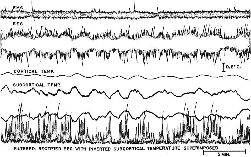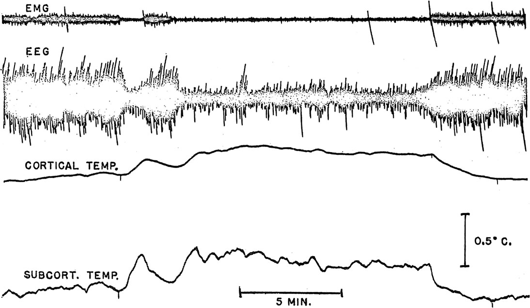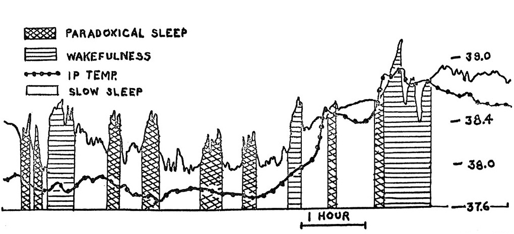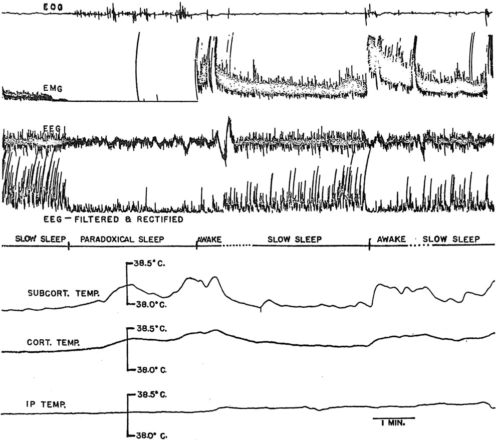 Increased unit firing rates in several brain areas (Bizzi et al. 1964; Evarts 1962, 1964; Huttenlocher 1961) and the dreams of humans (Aserinsky and Kleitman 1953; Dement and Kleitman 1957) during paradoxical sleep suggest increased cerebral metabolism during these periods. This possibility was studied by using variations in brain temperature in the cat as an index of changes in cerebral metabolism. Preliminary reports of increased brain temperature during paradoxical sleep have come recently from three different laboratories (Hanai and Delgado 1965; Kawamura and Sawyer 1965; Rechtschaffen et al. 1965). This report will document further and elaborate upon brain temperature-paradoxical sleep relationships and will consider their implications for the correlation between sleep, consciousness, EEG, and cerebral metabolism.