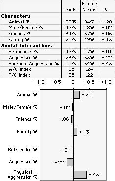 Now take a look at some of the other indicators and findings for "Characters." Whether we look at the percentage and "h" differences under "animal percent," "male/female percent," or "family percent" in the table, or at the length of the bars in the h-profile, we see that girls and women do not differ very much as far as the characters in their dreams.